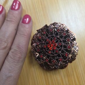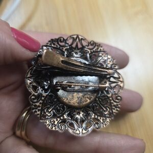 This stunning brooch features intricate red and black detailing, perfect for adding a touch of elegance to any outfit.