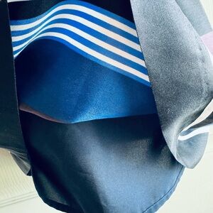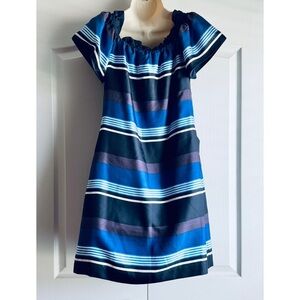 New with tags. No flaws. Details: striped, ruffle off the shoulder, short sleeve, pockets, lined, mini length, shift style. Material: silk. Laying flat: pit 17 inches; waist 17.5 inches; length 32 inches.