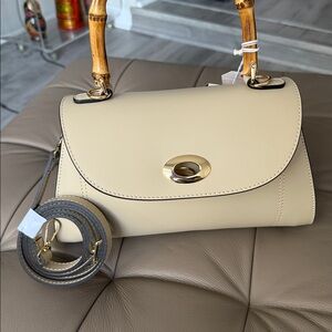 Elevate your style with this chic beige real leather satchel, featuring a distinctive bamboo handle. Perfect for any occasion. New.