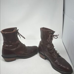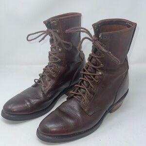 Preowned. Lace up Roper style work boots. One and a half inch heel. Notice only minor scuffs throughout scratch on right side of right boot and toe. Slight wear on both heels as pictured.