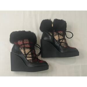 - Wedge red plaid with black fur boot size 6