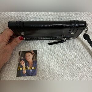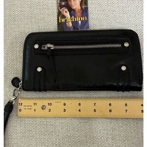Brighton patent leather zip-around wallet/wristlet. It features a black, glossy exterior, silver-tone