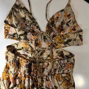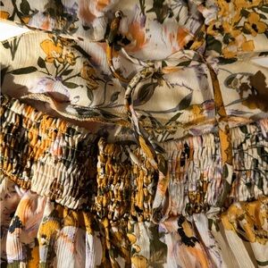 Elegant maxi dress with vibrant floral design. Features a blend of yellow and cream hues. Perfect for special occasions the dress is long and flowy . The material is light and fresh. Dress features a high double split cutout in the front that reveals both legs when you walk . Sexy cutout with adjustable spaghetti strap that crosses and closes mid back. The dress is very sexy and stunning . Perfect for a girls brunch or a dressy outing to dinner / winery :)