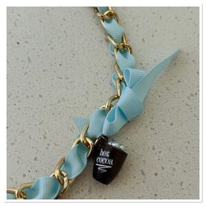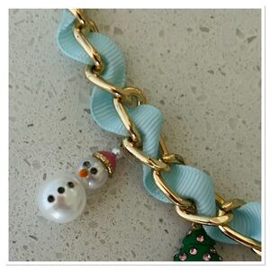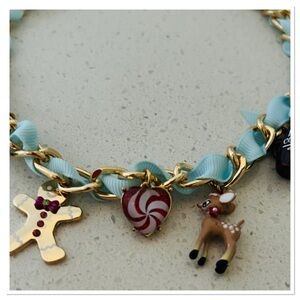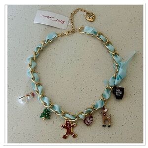 Blue Woven Ribbon Chain Multicolour Holiday Gingerbread Man Snowman Reindeer Hot Cocoa Peppermint Heart Christmas Tree Lobster Clasp Closure Bib Necklace By Betsey Johnson