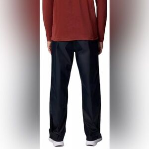 This is a pair of Columbia Men's Black Relaxed Fit Joggers. They are made of 100% nylon woven material for waterproof, breathable protection and have an elastic waistband with a drawstring for a secure, adjustable fit.