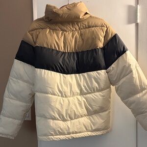 NWT Stylish and warm puffer jacket. Features cream, tan, and black color blocks. Ideal for cold weather.