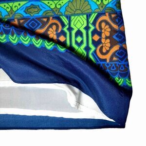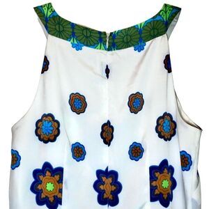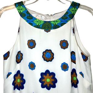 This fully lined halter style sleeveless shift dress has a floral medallion pattern on top on a cream background. The medallions start small and gradually get larger. They blend into a colorful skirt that ends in a navy blue border. In excellent used condition.