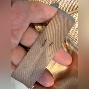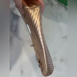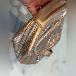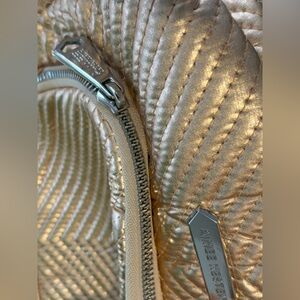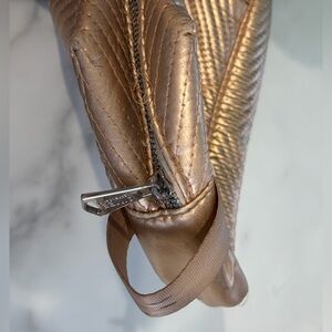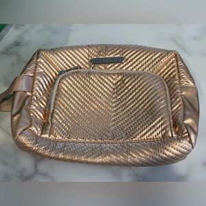 Stylish metallic gold cosmetic bag. Features quilted design. Perfect for travel or daily use.