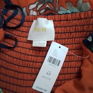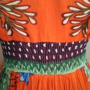 This is a gorgeous floral maxi dress from Anthropologie's Maeve collection. The dress is orange with hues of blue, green, and white in a floral print. Is has a v-neckline, smocking, adjustable spaghetti straps, and is lined. Size 8P; 100% viscose; lining: 100% rayon. NWT; Excellent condition.