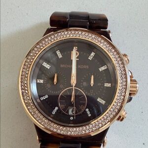 Stylish Michael Kors watch with a tortoise strap and gold-tone bezel. Perfect for any occasion. Watch face is 1.5” diameter. Crystal bezel. NEEDS BATTERY