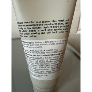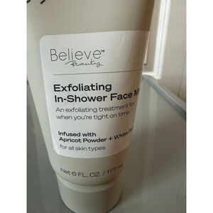 This is a Believe Beauty Exfoliating In-Shower Face Mask in a 6 fl. oz. (177 mL) tube. The product is beige with black text, featuring "SKIN" vertically on the side and "Believe Beauty" on the label. It is described as an exfoliating treatment infused with Apricot Powder + White Peony, suitable for all skin types. The tube has a ribbed cap and appears new with no visible signs of wear or damage. The packaging states it is made from 30% post-consumer recycled plastic.