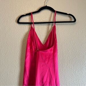This Victoria's Secret jumpsuit in size M features a V-neckline and spaghetti straps with adjustable straps for a comfortable fit. Made from 100% polyester satin fabric in a solid pink color, this pre-owned one-piece garment has a sleek and stylish design. The jumpsuit also includes a zip closure and wide-leg silhouette, perfect for a fashionable look with a cross theme accentuated by the strap detail. Easy to care for with machine washable instructions, this jumpsuit is a trendy addition to any women's wardrobe.