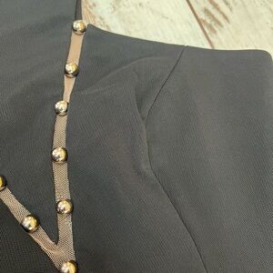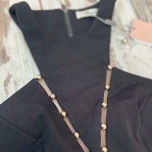 three floor dress, black embellished dress, halter dress, mesh detail dress, british designer dress, event wear dress, women’s size 0 dress, XXS dress, cocktail dress, formal black dress, NWT designer dress, high low hem dress, evening wear