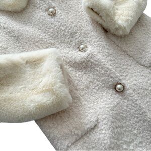 Color: Cream. Faux pearl button front. Lined. Front pockets. Faux fur trim.