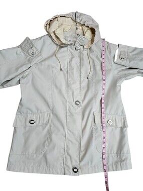 The exterior is a soft, structured stone / light khaki shell with a classic utilitarian silhouette — clean lines, oversized patch pockets, and a timeless hooded design. Inside, the playful sailboat motif adds heritage coastal character, very New England prep / yacht club energy, which collectors and coastal buyers actively seek.