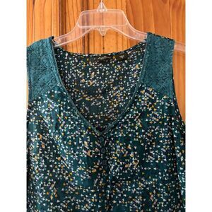 Lightweight cotton tank with lace details at the front shoulders. Vneck with 3 buttons at the base of the V. Sheer fabric. Pit to pit measure is 19 inches. Length is 28 inches.