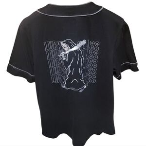 Lurking Class Sketchy Skull Reaper Black Baseball Button Up Shirt Sz Large Pre-owned Chest Measurement is 23" Small white mark on back of one sleeve. See pics!