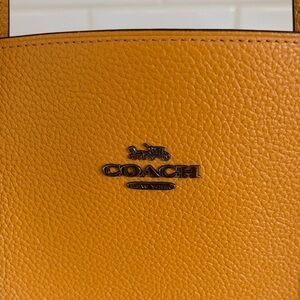 Absolutely gorgeous leather COACH tote bag. No scratches or imperfections. Feet on bottom of bag show a little wear (see final photo). The tote bag is very spacious. Two large sections with a zipper section in the middle. Also has two small pockets. The bag (without handles in measurements) is 13.5 inches wide, 6 inches deep, and 10.25 inches tall. The bag is 17.25 inches tall with the handles. This bag is the perfect color for spring 🌼 and fall 🍂. The leather smells lovely. **NOTE: This bag does NOT have a long strap or a Coach keychain/tag attached.**