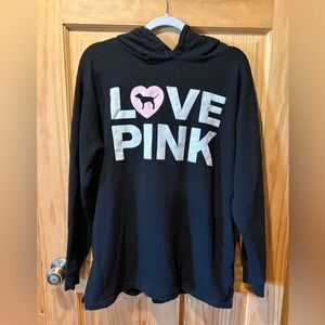 This Victoria's Secret PINK Campus Pullover Hoodie is black with "LOVE PINK" printed across the chest in white letters, featuring a pink heart graphic with the brand's signature dog logo inside the 'O'. The hoodie typically has a relaxed or oversized fit, a hood with adjustable drawstrings, and a kangaroo or side pockets. It is commonly made from a soft cotton-polyester fleece blend material. Chic black hoodie with bold 'Love Pink' graphic. Features pink heart and white lettering. Ideal for everyday comfort. GUC = Good Used Condition. See photos for approximate measurements to ensure an accurate fit. Thanks for looking!