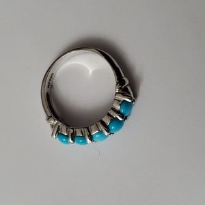 The bracelet has a series of turquoise inlays, each separated by thin metal bands. The turquoise pieces vary in color, displaying shades of green and blue with earthy brown matrix patterns, indicative of natural turquoise. The base of the bracelet is made of copper, which complements the earthy tones of the turquoise. The design is likely inspired by Native American or Southwestern jewelry styles, known for their use of turquoise and copper.