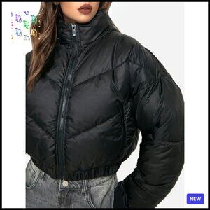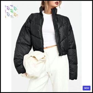 Cropped Puffer Jacket Winter Warm Quilted Zip Up Stand Collar Chic