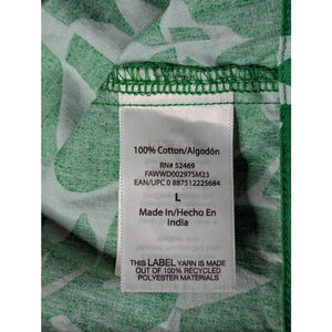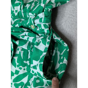 This is a pre-owned Free Assembly women's midi dress in size L, featuring a green and white leaf print. The dress has a collared V-neck, short sleeves, and a button-front closure. It includes a self-tie belt at the waist and two side pockets. The fabric is 100% cotton, and the dress was made in India. The dress measures approximately 47 inches in length and 20 inches across the bust when laid flat. Only worn once.