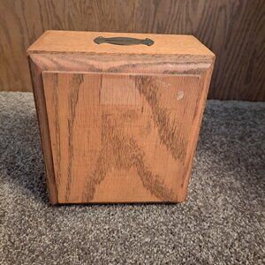 It is housed in a custom-made wooden box, typically oak, with a coin slot added to the top or back to function as a piggy bank.