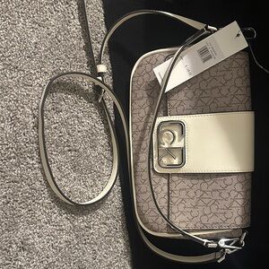 Elegant Coach belt bag with brown and tan leather. Features iconic logo design. Perfect for hands-free style.