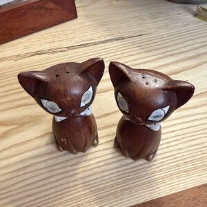 vintage Mid-Century Modern winking cat salt and pepper shakers, likely from the 1960s.