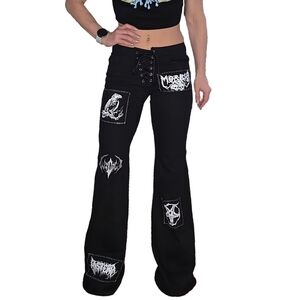 NWT Dolls Kill Black flare jean Pants w white embroidered patch design Size XS