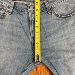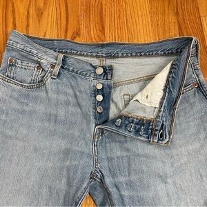 LEVI’S 501 Button Fly Denim Blue Jeans Destroyed Distressed Patch 33” W x 27” L