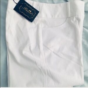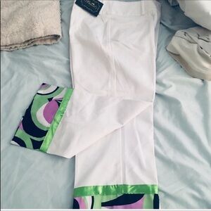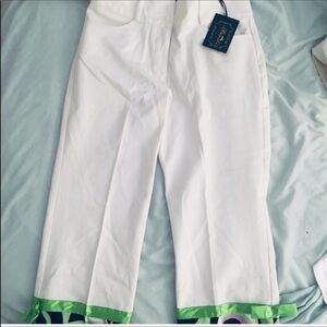 Adorable white stretch capris from Brazil with beautiful detailing on bottoms of him missing one button on green bow two pocket wide belt loops clasp and zip closure back darts 22” inseam New with tags