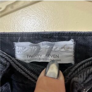 The We The Free Button Fly Skinny Zuri Mom Jean in washed black is a stylish and versatile pair of jeans for women in size 27. Made from a comfortable cotton blend denim fabric with a raw wash, these high-rise jeans feature a button closure and a solid black color. The skinny fit and regular style make them a fashionable choice for everyday wear, with added accents like button detailing and pockets for added flair.
