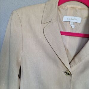 Escada Blazer Jacket. Button front closure. Dual front pockets. Lightweight shoulder pads. Button cuff sleeve. Gold Label. Perfect staple piece to have in your closet. Can be worn with denim jeans or linen pants for a dressier look or even over a dress.