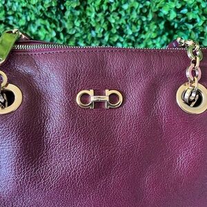 Elevate your everyday look with this authentic Salvatore Ferragamo shoulder bag in a rich burgundy leather.