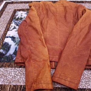 Bagatelle Women’s Faux Leather Motorcycle Jacket Size Small Color is a light tan to camel hint of orange brown summer Moto Jacket concerts event date night zipper detail