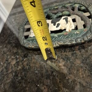 Vintage cast iron trivet with country style cow. This has multiple chips on it and rust spots.