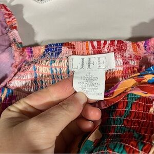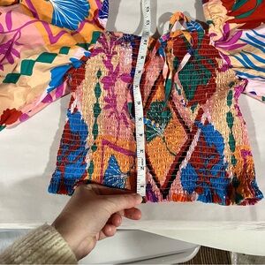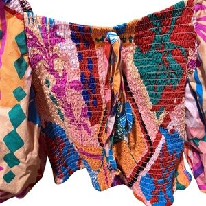 Embrace vibrant style with this colorful bohemian smocked crop top with puff sleeves. Perfect for adding a splash of color to your wardrobe. Size small. In good preowned condition.