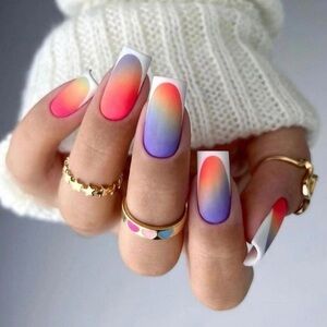 Elevate your style with this stunning colorful French tip nail art set. Featuring vibrant shades of pink, orange, and purple, these nails are perfect for any occasion.