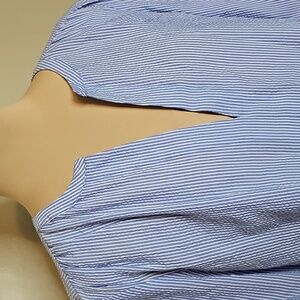 Chic light blue blouse with elegant stripes. Features a flattering neckline and flowing sleeves. Ideal for versatile styling. Ann Taylor Light Blue Striped Seersucker Blouse Flare Sleeves Medium in excellent condition