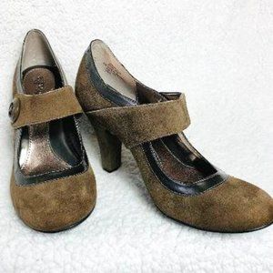 These shoes have a distinctive two tone, black and white design with classic brogue perforations and scalloped edges. They feature a T-strap with a buckle closure for a secure fit, pointed toe with a slim heel. Combining a vintage spectator style with a modern, sleek pump silhouette.