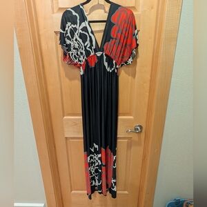 123 black v neck, ankle length floral dress, size OS, small, medium, large