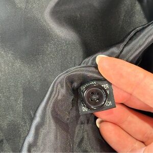 Notable features: Front button closure, adjustable back waist strap, front welt pockets, lined interior, dramatic embroidered back panel with horse motif