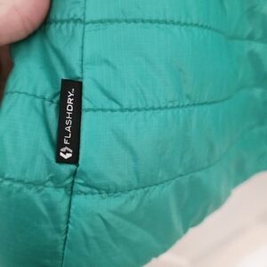 The North Face ThermoBall Jacket, women’s size small in green. This lightweight, insulated ThermoBall jacket features a flattering quilted design, zippered pockets, and a high collar. Perfect for chilly days, travel, or layering. Green with navy lining.
