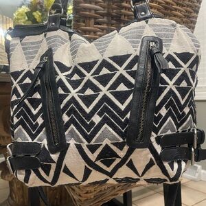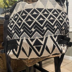 This American Eagle Outfitters tote showcases a bold black and white geometric design, offering a modern and stylish look. Crafted with a structured shape and durable black straps, it combines functionality with fashion, making it an ideal accessory for any occasion.