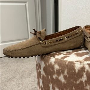 Elegant brown suede drivers featuring lace detail. Ideal for a sophisticated look. These Original Car Shoe comes with two dust bags for storage. Size 11, these have been cared for and gently worn- with some scuffs. Lots of life left in these! Clean inside.