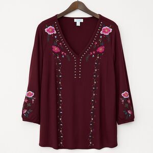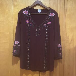 Cupio Blouse Womens XL Burgundy Floral Embroidery Boho Peasant Folk Hippie