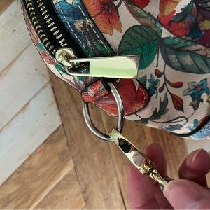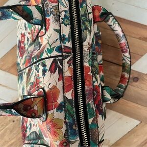 Stylish floral women's Steve Madden purse with vibrant colors. I love this bag but don’t use it enough. Great size with lots of pockets and a detachable strap. Please note the rings that the strap attach too I did get replaced so they are silver and therefore do not match the gold hardware on strap and purse. It’s not very noticeable in my opinion when the bag is worn though. Thanks for looking!