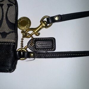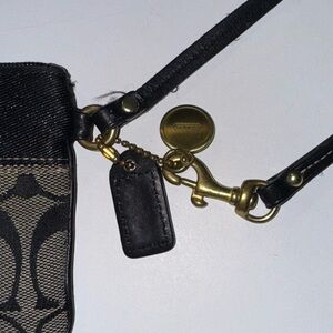 Coach wristlet with signature pattern. Features gold accents and a sleek design it’s missing the pull on the zipper and has a small spot (check pictures) overall hardware has wear from being used but still in great condition!
