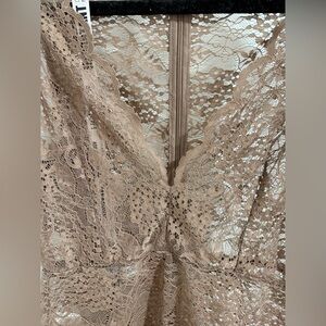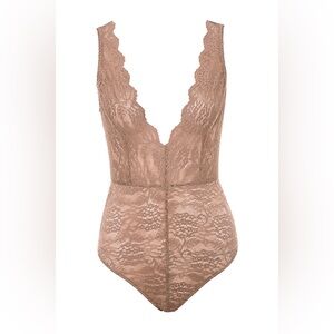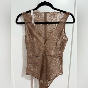 House of CB Valeri Lace Bodysuit Taupe Brown Plunge Neck Size S NWT